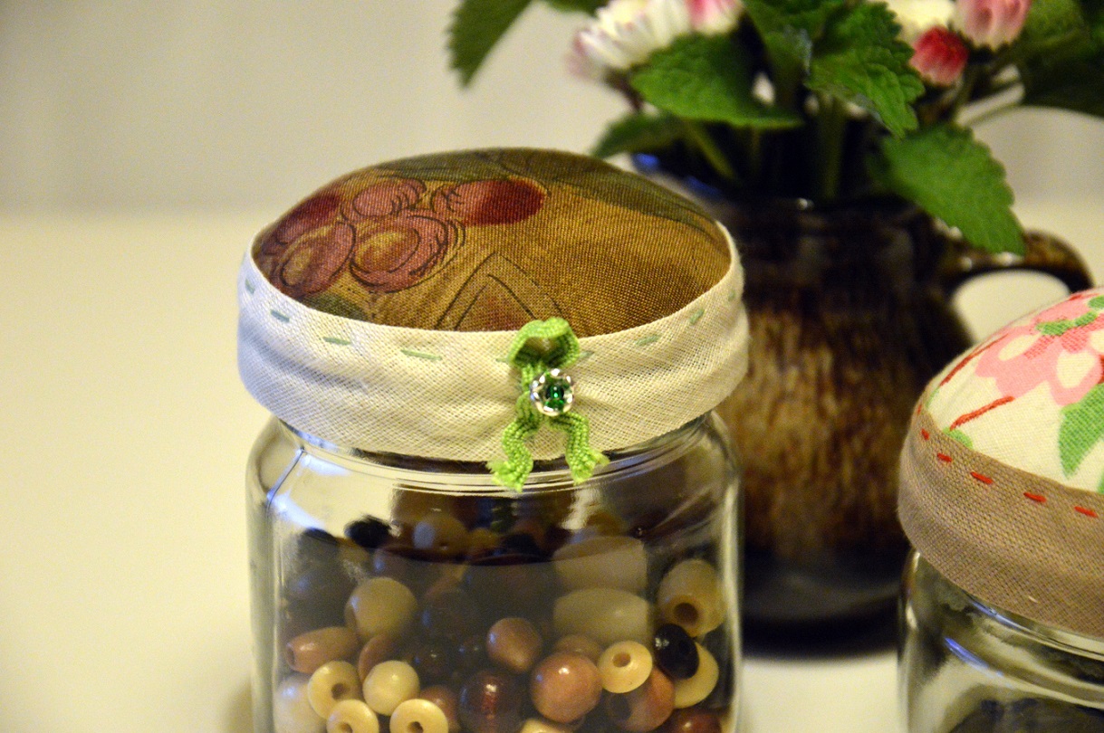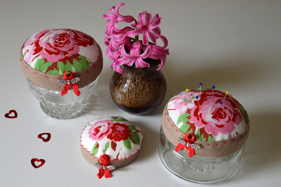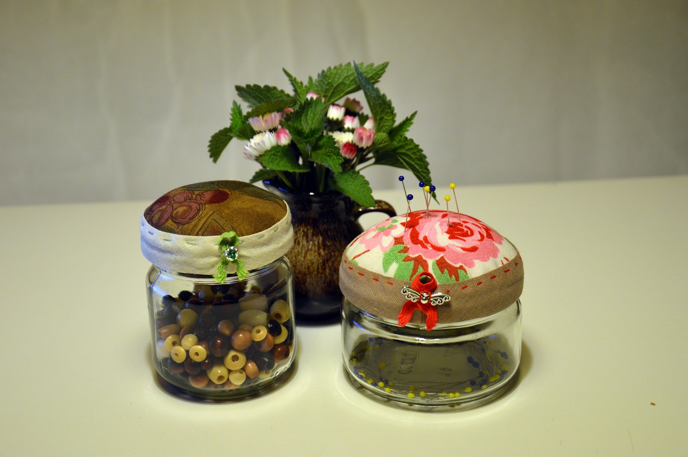 Я уже давно хотела сделать себе вместительную игольницу два-в-одном: баночку, в которой можно хранить пуговки или всякие другие швейные мелочи - нитки, булавки, бусинки и т.д., а сверху - мягкую подушечку для иголочек.