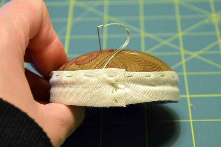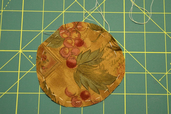 2. У нас уже готова заготовка из ткани для верха (2 см выше крышки); на расстоянии 1 см от края прошиваем швом "вперед иголка". Нитку не обрезаем!