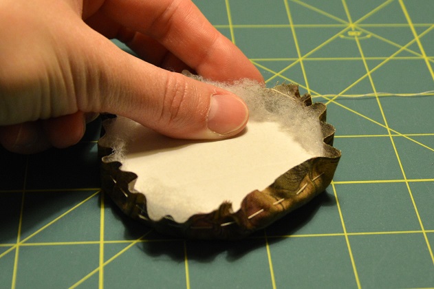 7. Получившуюся подушечку приклеиваем к крышке; если вы сомневаетесь в своём клее можно крышку немного прошкурить наждачной бумагой; поверхность станет шершавой - тем самым улучшит сцепление. Капли клея распределяем по "периметру" крышки на расстоянии 1 см от края... обязательно почти замкнутым кругом! (это процесс я не успела запечатлеть, т.к. клей с термописталета сохнет моментально)