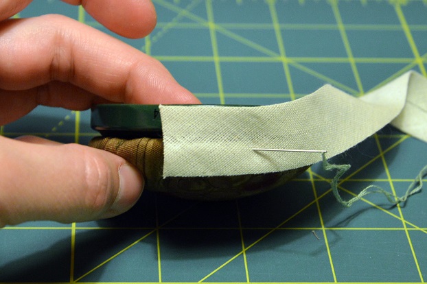 9. Прикладываем полоску ткани к краю крышки и пришиваем (можно просто приклеить - кому не нравиться такой вид оформления); она должна плотно прилегать к боковине крышки. Важно: пришивая, натягивайте ткань и тогда она даже будет держаться без дополнительного приклеивания!