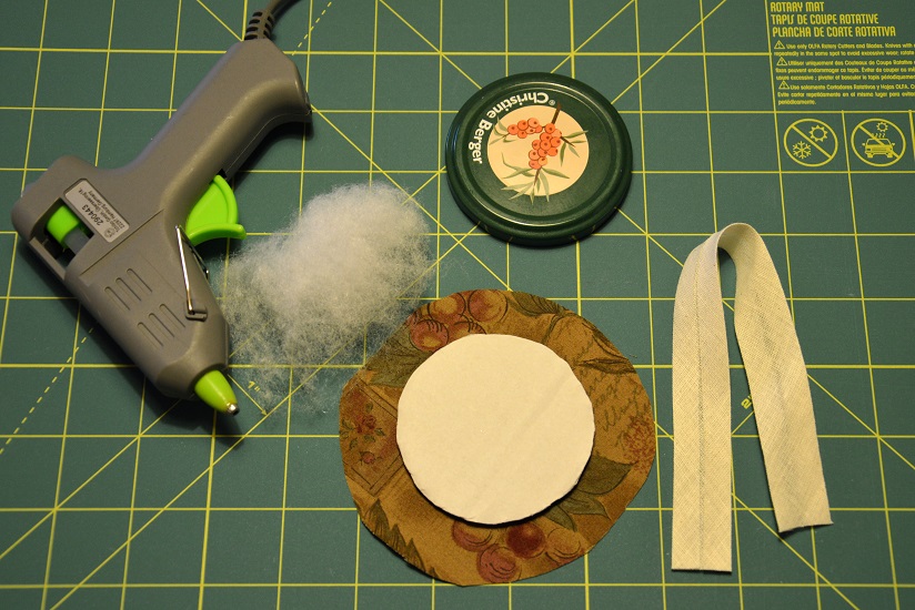 б) ткань для верха: кусок ткани или вышитый мотив размером чуть больше крышки (2 см шире);