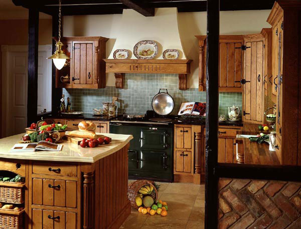 Кухня в стиле кантри – мечта любой хозяйки. Деревенская кухня – это обеденный стол, буфет, табуреты или стулья из цельной древесины. В такой кухне вряд ли найдётся хрупкая посуда – кантри не декоративен. По кухне развешаны косы лука, на полу – плетеные корзины с овощами.