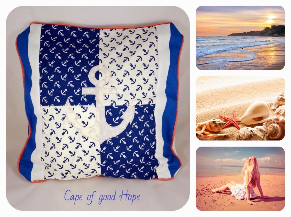 Знаете, если сразу после фотографирования не обрабатываешь картинки, а складываешь на потом; затем отсылаешь заказ.... и....лишь намного позже садишься и сражаешься над фотографией, чтобы она выдала тот самый живой эффект, что было при "жизни". Эх... поэтому сейчас не передаётся сочный коралловый цвет в якорной отделки аппликации и канта. А жаль, подушка получилось эффектной и якорь выделялся, благодаря кораллом цвету ниток "Мулине", вручную обшитый по краям аппликации.