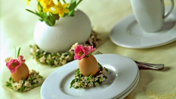Как на счет мини вазы из пустой яичной скорлупы, в которые вставлены свежие цветы? Чтобы избавить скорлупу от содержимого, возьмите сырое яйцо проделайте иголкой одну небольшую дырку внизу и одну сверху яйца и аккуратно выдуйте содержимое. Затем промойте и высушите скорлупу. Теперь нужно увеличить осторожно ножом открытие для вазы в верхней части. Низ скорлупы можно прикрепить к тарелке, например, воском от свечи.