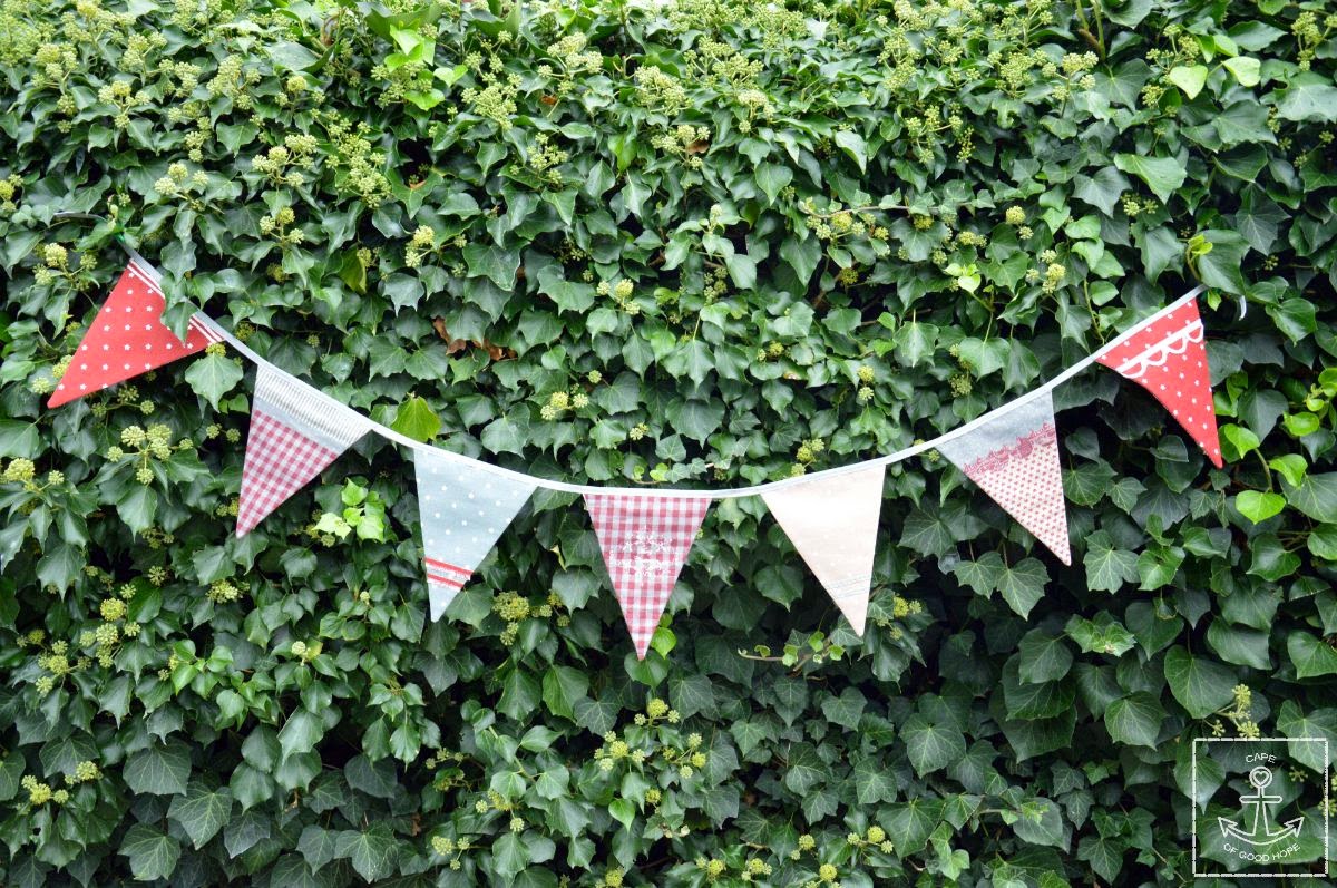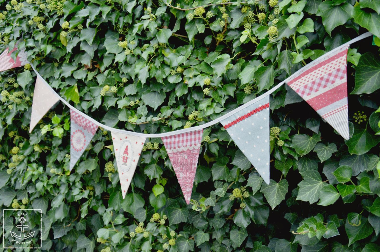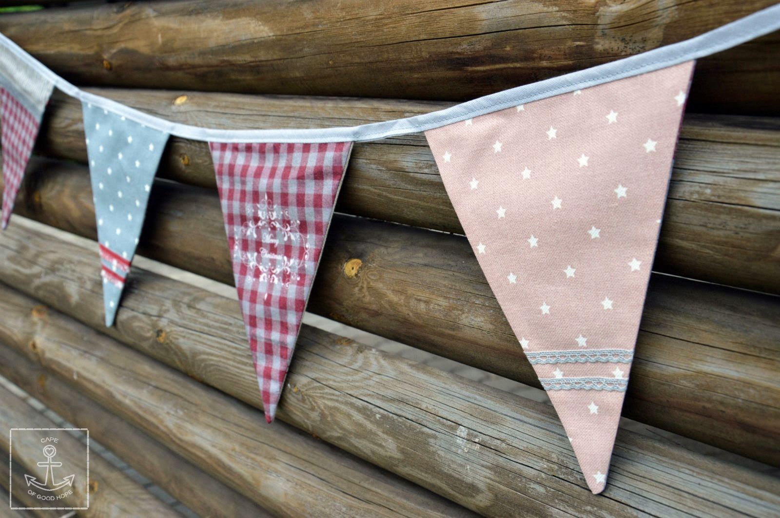 Она получилась двухсторонняя, текстильная из хлопка, состоит из семи флажком (подумала, что такое количество будет симметричным относительно центра и очень символичным). Вешать её можно и проходе, и на улице, и над камином (которого нету) :)) - с каждой стороны она разная, т.е флажки почти не повторяются.