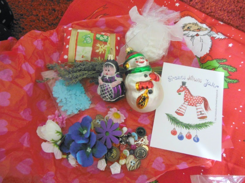 Такой вот подарок пришел Виктории Наухацкой (про получение я писала, а картиночки не показывала) от Лены Штарк ... я писала, что они из Гамбурга.... помимо приятных сюрпризов: ёлочные игрушки, кухонное полотенце, разные пуговки и брадсы, цветы, свеча, мягкая лошадка, открытка... были ещё ароматная подушечки с запахом лаванды и букетик лаванды. Виктория очень довольна :) чему и я сама рада!