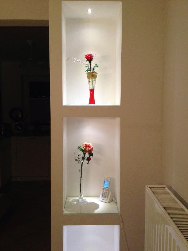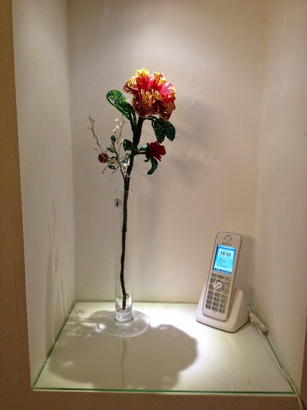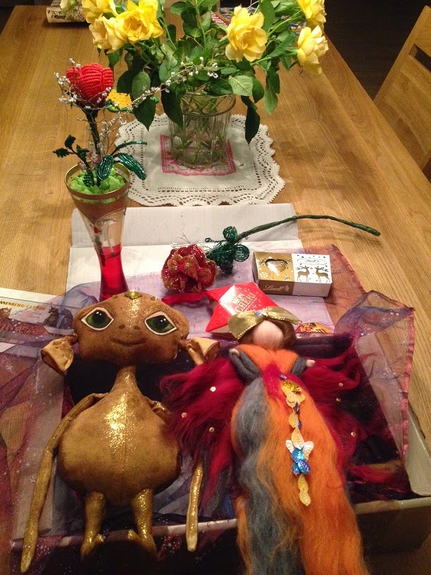 "Это было что-то. Я такого еще никогда не видела. Такое впечатление, что она решила поздравить меня со всеми праздниками за весь год. Там была чудесная Вальдорфская кукла, от которой я в восторге и которую повесила в коридор. Хоть дочка и говорит, что она осенняя, но мне кажется, что это мой портрет. У нее рыжая коса и одета в платье моих любимых оттенков. Я заявила всем сразу, что кукла будет жить в коридоре постоянно!!! Потом, в коробке лежал мой заказ - цветы в нишу. Именно цветы, потому что их было два. Оба из бисера и сверкают они по вечерам золотом и рубинами. Муж сказал, что это ювелирная работа и он восхищен работой мастера. А удивить мужа очень трудно.