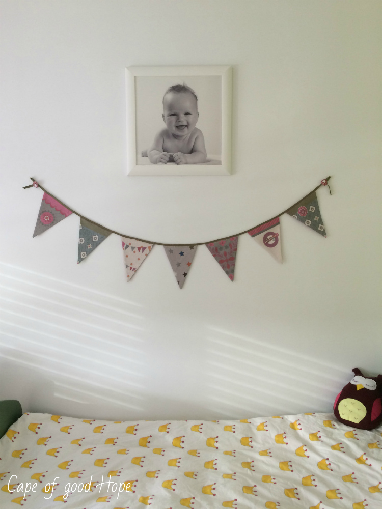 На окнах у нее тюльпаны цветут (на днях еще снежинки появятся самовырезанные из бумаги), в центре комнаты раскинут шатер, над кроваткой фото маленькой дочки и самодельная гирлянда из ткани, двухсторонняя. С каждой стороны разный мотив :)
